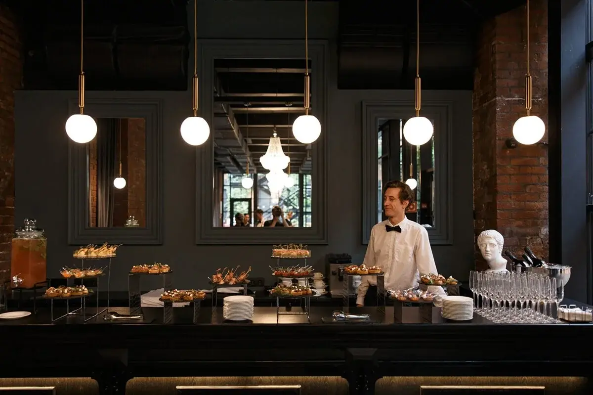 - Персонал (официанты, бармены, координатор, кухня, грузчики). Для корпоративных форматов: «1 официант на 20−25 гостей» как ориентир.